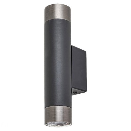 Matt fekete színű fém fali lámpa ezüst gyűrű dekoros búrával, 2db GU10-es foglalattal. A lámpa felfelé és lefelé egyaránt világít.