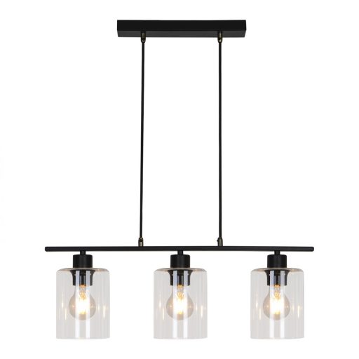 Matt fekete színű fém vázas függeszték henger alakú, átlátszó üveg búrával, textil kábellel.