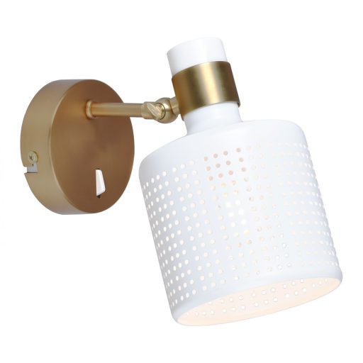 Arany és fehér színű fém falikar lámpatesten lévő kapcsolóval.