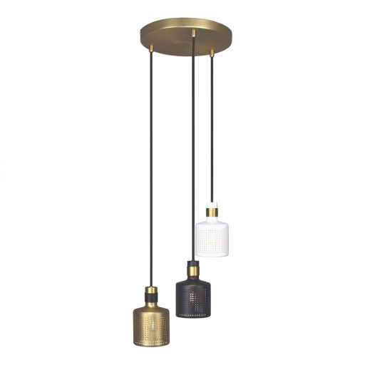 Arany színű fém vázas függeszték lámpa fehér, fekete és arany színű búrákkal, fekete színű textil kábellel.