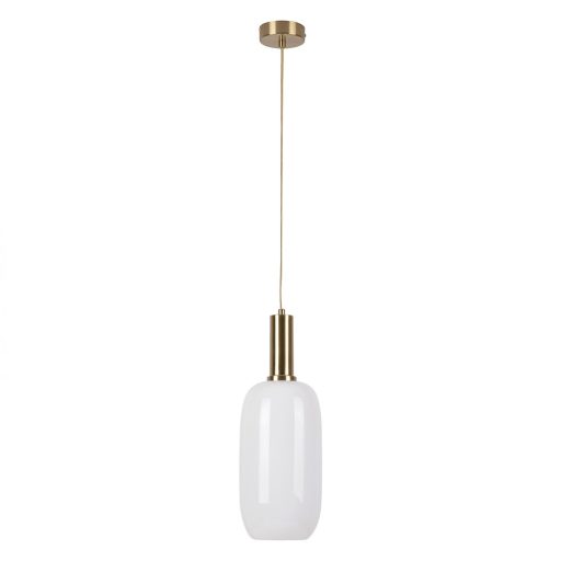 Arany színű fém vázas elegáns függeszték lámpa fényes fehér színű opál üveg búrával, textil kábellel.