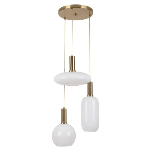 Arany színű fém vázas elegáns függeszték lámpa fényes fehér színű opál üveg búrával, textil kábellel.