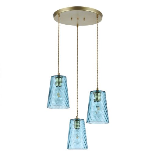 Arany színű fém vázas függeszték csavart mintás azúr kék színű áttetsző üveg búrával, textil kábellel.