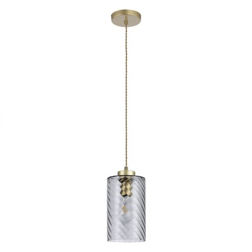 Arany színű fém vázas függeszték csavart mintás füstszínű áttetsző üveg búrával, textil kábellel.