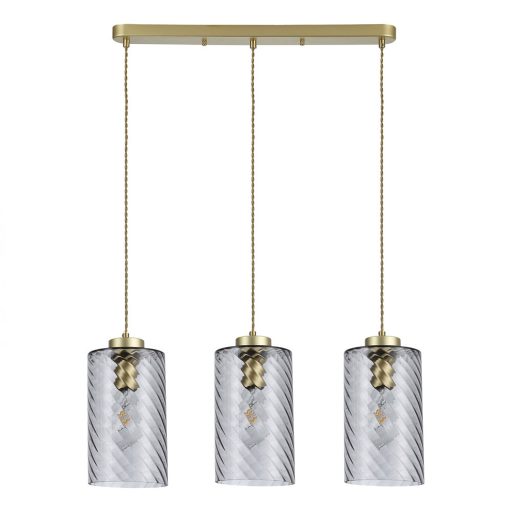 Arany színű fém vázas függeszték csavart mintás füstszínű áttetsző üveg búrával, textil kábellel.