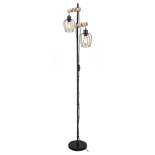 Matt fekete színű fém álló lámpa fa betéttel, rácsos búrával, E27-es foglalattal, vezetékre szerelt kapcsolóval.