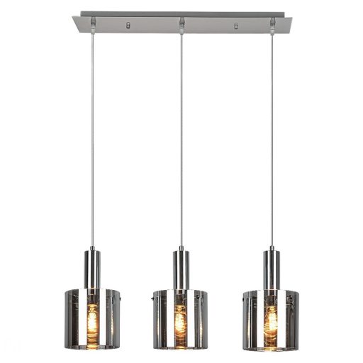 Króm színű fém vázas függesztett lámpa füstös üveg búrával, E27-es foglalattal.