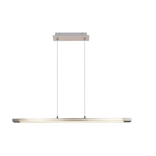 Szatinált króm színű fém vázas függeszték lámpa fehér színű műanyag betétes búrával, 27W meleg fehér színhőmérsékletű, beépített LED fényforrással. A lámpa fényereje érintéssel 3 lépésben szabályozható (15%-40%-100%).