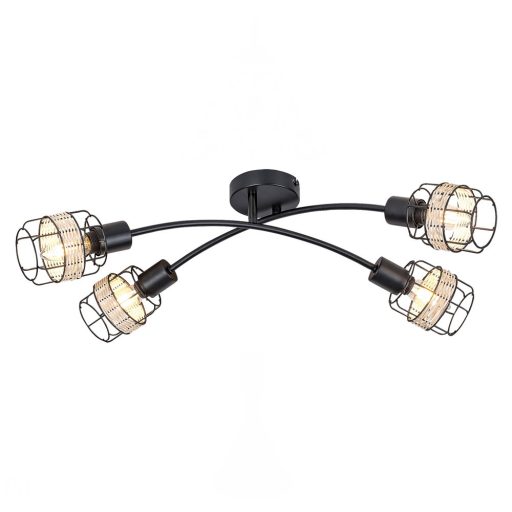 Matt fekete színű fém mennyezeti lámpa natúr rattan betétes, rácsos búrával, 4db E14-es foglalattal.
