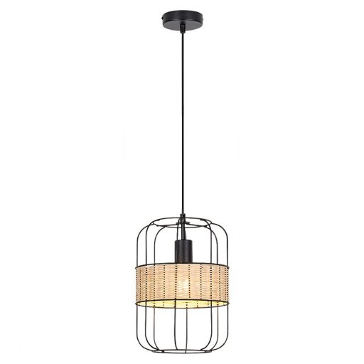 Matt fekete színű fém függesztett lámpa natúr rattan betétes, rácsos búrával, 1db E27-es foglalattal.