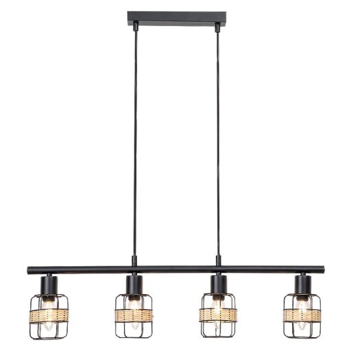 Matt fekete színű fém függesztett lámpa natúr rattan betétes, rácsos búrával, 4db E14-es foglalattal.