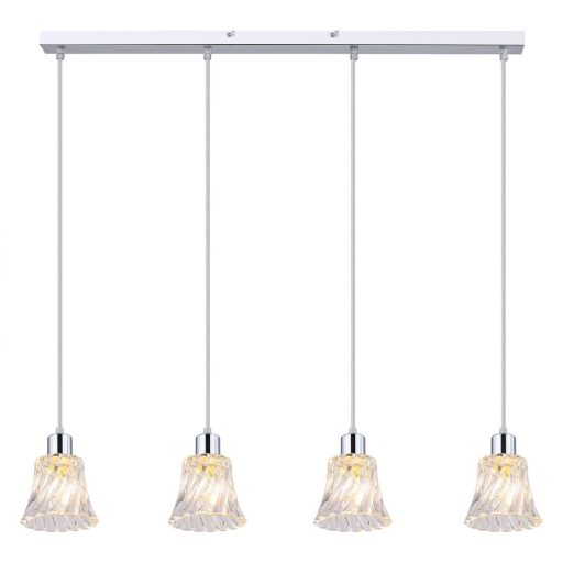 Króm színű fém vázas függeszték lámpa átlátszó, elegáns, csavart üveg búrával.