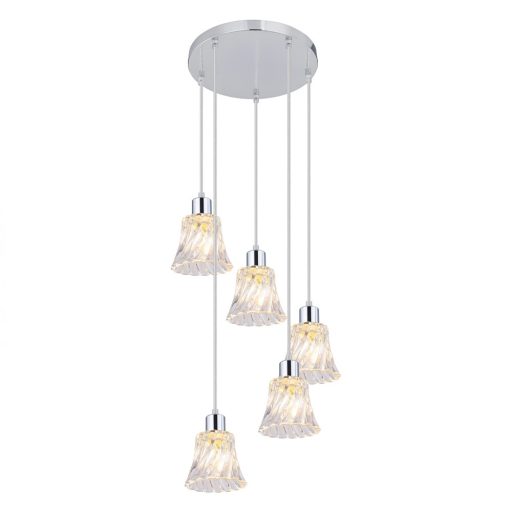 Króm színű fém vázas függeszték lámpa átlátszó, elegáns, csavart üveg búrával.