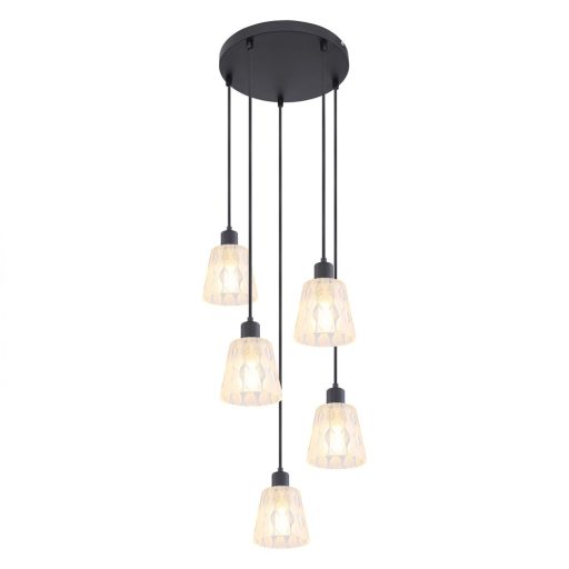 Fekete színű fém vázas függeszték lámpa textil kábellel és mintás, átlátszó üveg búrával.