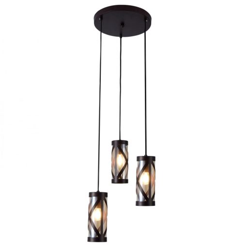 Skandináv stílusú függeszték kávé színű fém vázzal és borostyán színű, áttetsző üveg búrával.