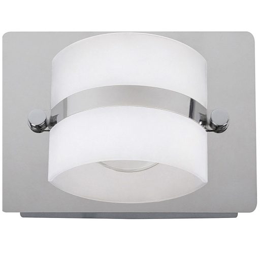 Modern megjelenésű fürdőszobai lámpa beépített energiatakarékos LED izzóval. A fali lámpa 11,5 cm magas, 16 cm széles, króm színű fém szerkezet és műanyag, opál színű lámpabúrával, IP44-es védettséggel. A beépített LED izzó A+ energiaosztály besorolású és 5W teljesítmény mellett 365 lumen fényerőt és 4000 Kelvines, természetes fehér színű fényt kínál. A lámpatestben az izzó nem cserélhető.