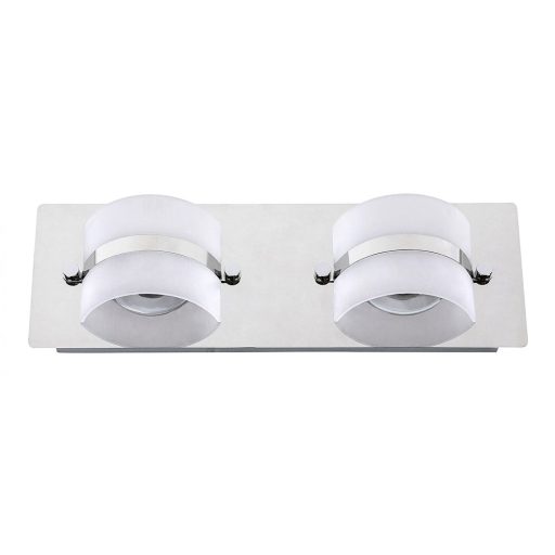 Modern megjelenésű fürdőszobai lámpa beépített energiatakarékos LED izzókkal. A fali lámpa 11,5 cm magas, 33 cm széles, króm színű fém szerkezet és műanyag, opál színű lámpabúrával, IP44-es védettséggel. A beépített LED izzók A+ energiaosztály besorolású és 2x 5W teljesítmény mellett 2x 365 lumen fényerőt és 4000 Kelvines, természetes fehér színű fényt kínálnak. A lámpatestben az izzók nem cserélhetők.