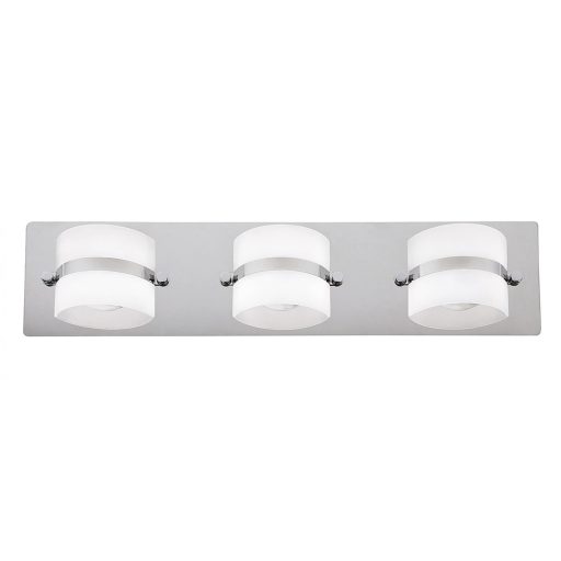 Modern megjelenésű fürdőszobai lámpa beépített energiatakarékos LED izzókkal. A fali lámpa 11,5 cm magas, 49,5 cm széles, króm színű fém szerkezet és műanyag, opál színű lámpabúrával, IP44-es védettséggel. A beépített LED izzók A+ energiaosztály besorolású és 3x 5W teljesítmény mellett 3x 365 lumen fényerőt és 4000 Kelvines, természetes fehér színű fényt kínálnak. A lámpatestben az izzók nem cserélhetők.