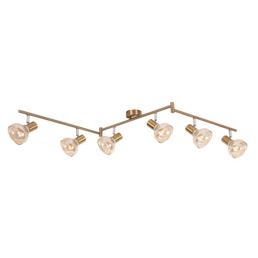 Tökéletes megvilágítás, ahogy mi szeretnénk: a Holly hatos spotlámpa állítható lámpáinak köszönhetően gondoskodhatunk róla, hogy a szoba minden szegletébe jusson elegendő fény. Ezt a gyönyörű, mutatós spotlámpát elsősorban a nappaliba vagy az étkezőbe ajánljuk. Választhatunk hozzű meleg fehér vagy természetes fehér fényű izzókat. A beltéri lámpa hat lámpafejét borostyánszínű, üveg lámpabúra borítja, és antik arany színű, fém dísztalp teszi elegánssá. A hatos spotlámpa teljes szélessége 1500 mm, a dísztalp átmérője 80 mm. A lámpa E14 típusú foglalataiba 6 db, egyenként legfeljebb 40 W teljesítményű, energiatakarékos izzót tehetünk. A lámpát fényforrás nélkül szállítjuk.