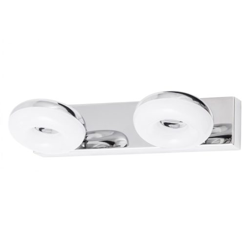Modern, elegáns stílusú fürdőszobai fali lámpa, króm színű fém vázzal és üveg betétes búrával, állítható fejjel, beépített LED fényforrással és IP44-es védelemmel.