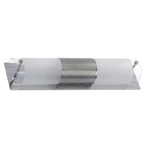 Modern stílusú fürdőszobai fali lámpa, króm színű fém vázzal és átlátszó szélű, opál üveg búrával.
