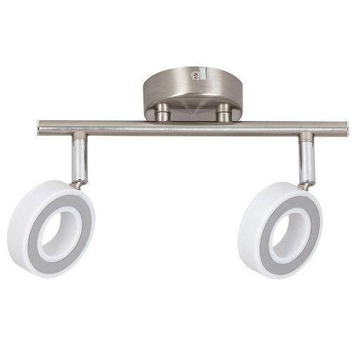 Modern megjelenésű fali vagy mennyezeti spotlámpa beépített energiatakarékos LED izzókkal. 26 cm széles, króm színű fémből készített lámpatest és pozícionálható, műanyag lámpabúrák IP20-as védettséggel. A beépített LED izzók A+ energiaosztályúak, teljesítményük 2x 4,5W, amelyhez 2x 400 lumen fényerő társul. Színhőmérséklete természetes fehér (4000 Kelvin). A lámpatestben a izzó nem cserélhető.