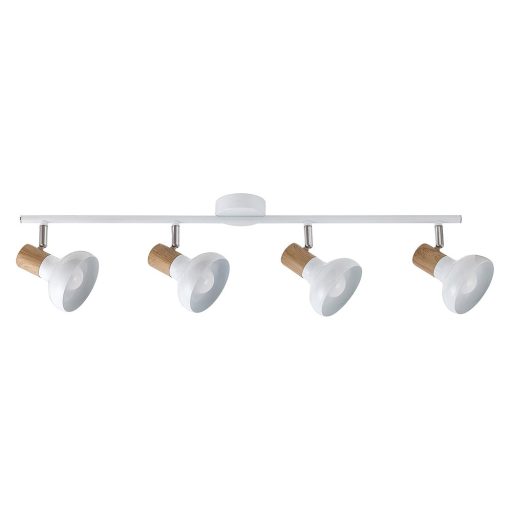 Skandináv stílusú mennyezeti spotlámpa 4 db foglalattal. 72 cm széles, fehér és bükk színkombinációjú fém lámpatest pozícionálható lámpabúrákkal, IP20-as védettséggel. A lámpatest E-14-es foglalatkialakítású, 4x max. 40W teljesítményű, energiatakarékos izzókkal is használható.