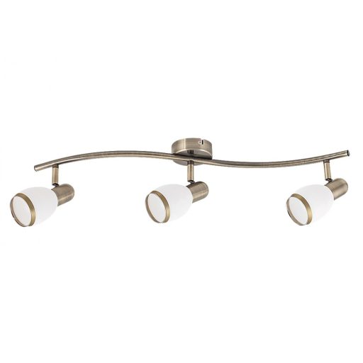Modern stílusú mennyezeti spot lámpa, bronz színű fém vázzal, bronz dekoros, opál üveg búrával. A lámpa állítható fejjel rendelkezik.