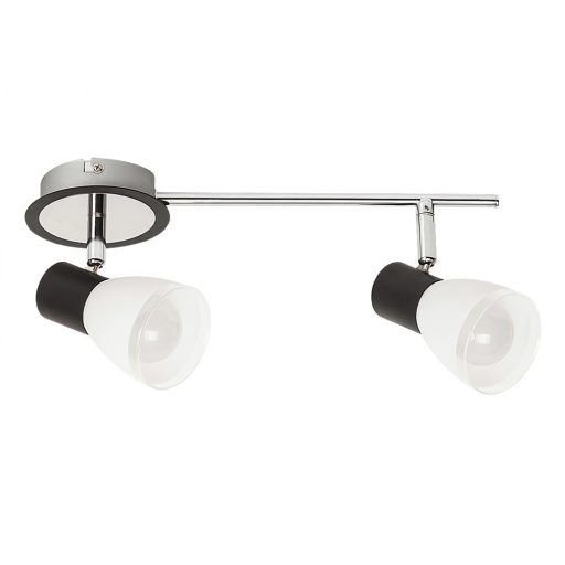 Modern stílusú mennyezeti spot lámpa, króm színű, fekete betétes fém vázzal, fekete és fehér színű üveg búrával, állítható fejjel.