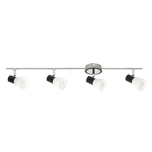 Modern stílusú mennyezeti spot lámpa, króm színű, fekete betétes fém vázzal, fekete és fehér színű üveg búrával, állítható fejjel.