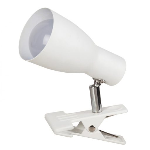 Modern stílusú csiptethető lámpa, fehér színű fém vázzal és búrával. A lámpa állítható fejjel és vezetékre szerelt kapcsolóval rendelkezik.
