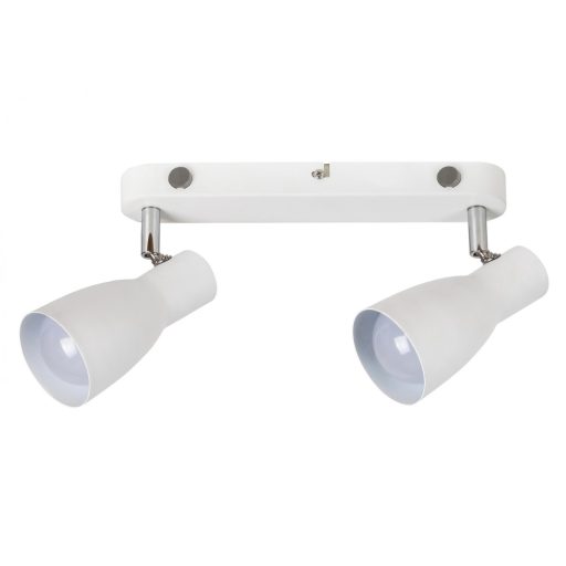 Modern stílusú fali spot lámpa, fehér színű fém vázzal és búrával. A lámpa állítható fejjel rendelkezik, a kapcsoló a lámpatesten található.