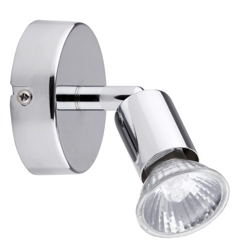 Modern stílusú fali spot lámpa, króm színű fém vázzal és búrával. A lámpa állítható fejjel rendelkezik.