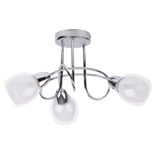 Modern stílusú mennyezeti lámpa, króm színű fém vázzal, kívül átlátszó, belül opál üveg búrával.