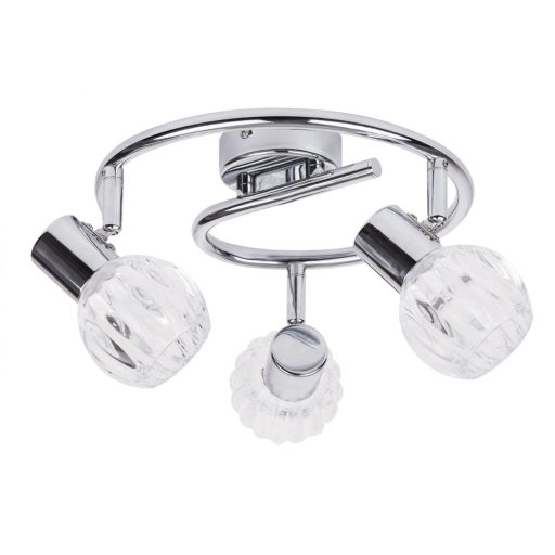 Modern stílusú mennyezeti spot lámpa, króm színű fém vázzal, átlátszó, mintás üveg búrával. A lámpa állítható fejjel rendelkezik.