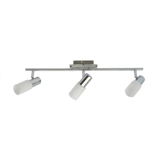 Modern stílusú mennyezeti spot lámpa, króm színű fém vázzal, fehér színű üveg búrával. A lámpa állítható fejjel rendelkezik.
