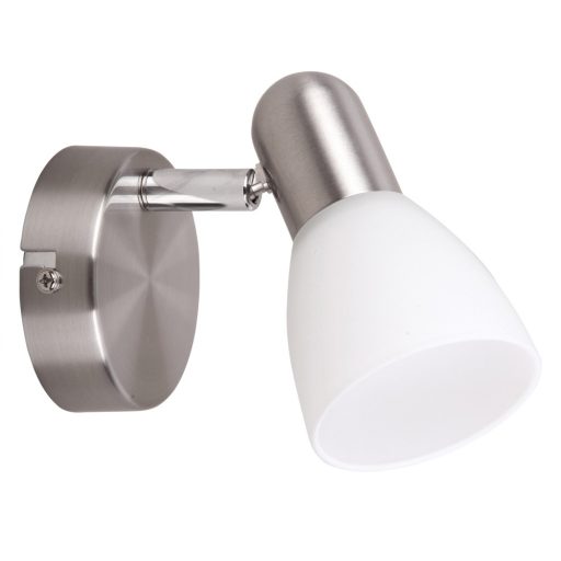 Modern stílusú fali spot lámpa, szatinált króm színű fém vázzal, fehér színű üveg búrával. A lámpa állítható fejjel rendelkezik.