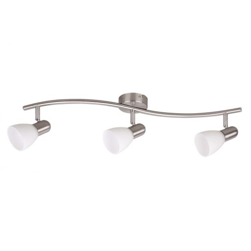 Modern stílusú mennyezeti spot lámpa, szatinált króm színű fém vázzal, fehér színű üveg búrával. A lámpa állítható fejjel rendelkezik.