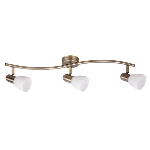 Modern stílusú mennyezeti spot lámpa, bronz színű fém vázzal, fehér színű üveg búrával. A lámpa állítható fejjel rendelkezik.