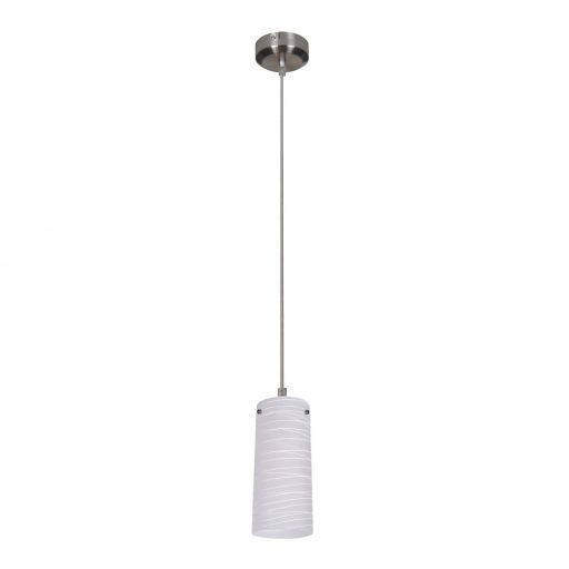 Modern stílusú függeszték, króm színű fém vázzal, fehér színű, átlátszó sávos mintás üveg búrával.