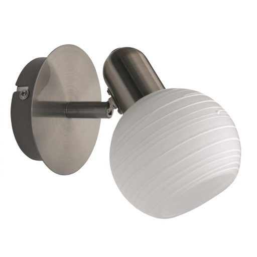 Modern stílusú fali spot lámpa, szatinált króm színű fém vázzal, fehér, csíkos mintás üveg búrával. A lámpa állítható fejjel rendelkezik.