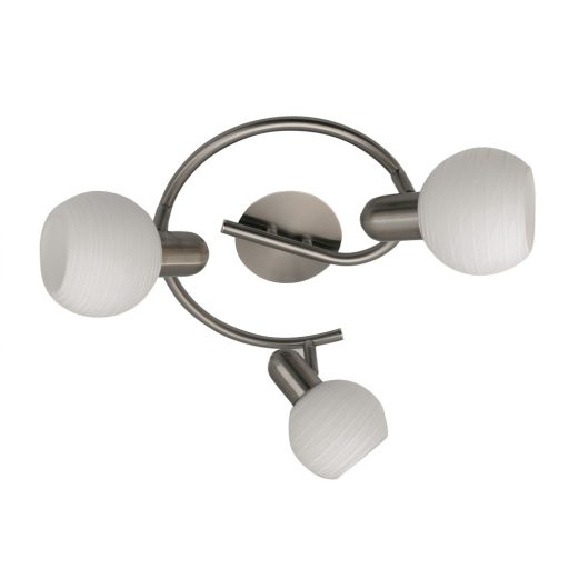 Modern stílusú mennyezeti spot lámpa, szatinált króm színű fém vázzal, fehér, csíkos mintás üveg búrával. A lámpa állítható fejjel rendelkezik.
