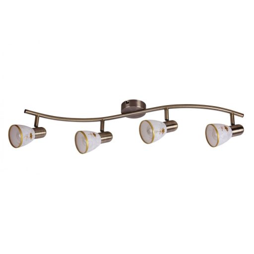Klasszikus stílusú mennyezeti spot lámpa, bronz színű fém vázzal, fehér színű üveg búrával, kézzel festett, arany színű, virág mintás dekorral. A lámpa állítható fejjel rendelkezik.