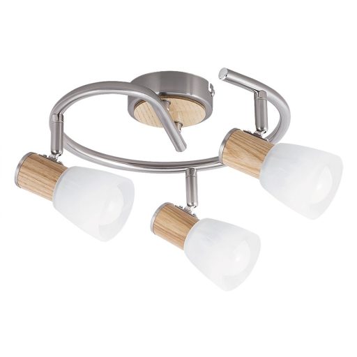 Modern stílusú mennyezeti spot lámpa, szatinált króm színű fém vázzal, bükkfa betétekkel és fehér színű üveg búrával. A lámpa állítható fejjel rendelkezik.