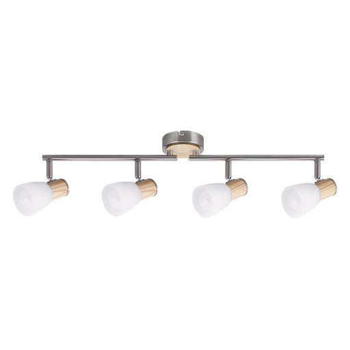 Modern stílusú mennyezeti spot lámpa, szatinált króm színű fém vázzal, bükkfa betétekkel és fehér színű üveg búrával. A lámpa állítható fejjel rendelkezik.