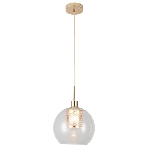 Dekoratív megjelenésű, arany színű fém vázas függeszték áttetsző üveg búrával.