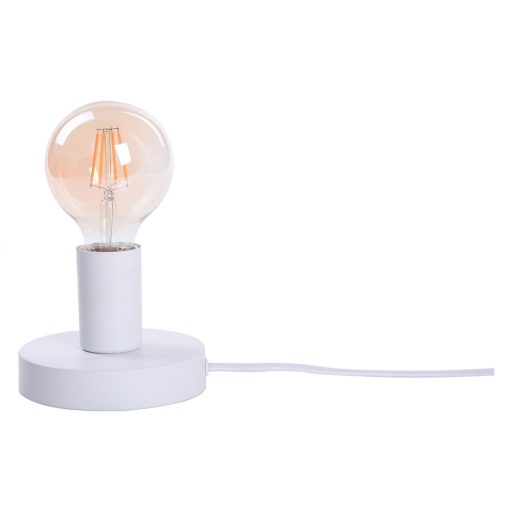 Fehér színű fém búra nélküli asztali lámpa vezetékre szerelt kapcsolóval.