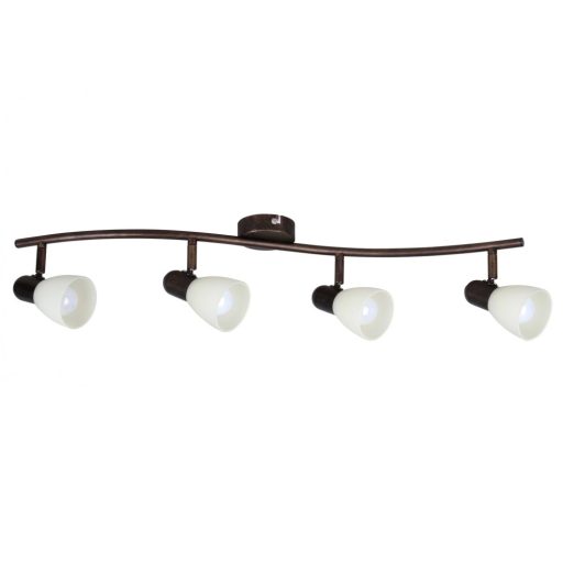 Klasszikus stílusú mennyezeti spot lámpa, antik barna színű fém vázzal, bézs színű, üveg búrával. A lámpa állítható fejjel rendelkezik.