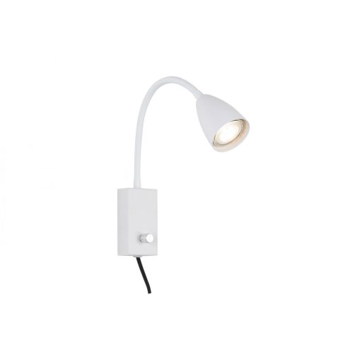 Modern stílusú fali lámpa fehér színű fém kivitelben. A lámpa hajlítható fejjel és vezetékre szerelt dugvillával rendlkezik.