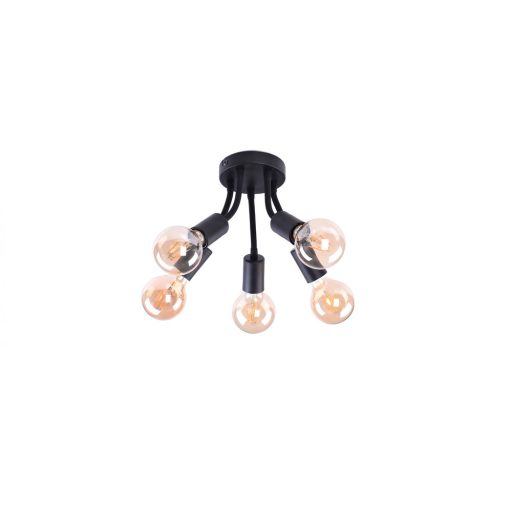 Fekete színű fém vázas búra nélküli mennyezeti lámpa állíhtató karokkal.